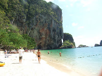 Railay Eastrol atgyalogoltunk a Phra nang beachre, ami a Lonely Planet szerint a vilag egyik legszebb strandja. Es most igaza lett, pedig feher homok nem is volt:-) Voltak viszont barlangok, es kulonfele falkepzodmenyek, ha jol emlekszem szinten meszkobol, fantasztikusan nezett ki az egesz! A kis obol tele volt turistaval, szalloda egyetlenegy uzemel itt, egy luxusszalloda ami igazan jo helyet valasztott maganak.