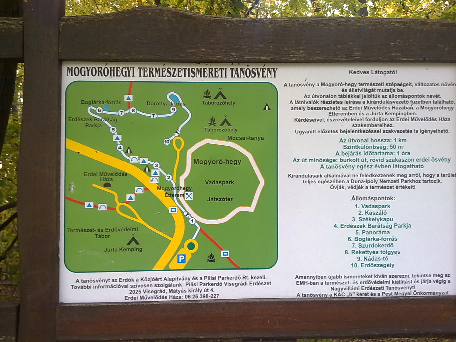 Autóval a Mogyoróhegy étterem parkolójáig mentünk. Innen a Mócsai tanyát megkerültük balról, így elértünk az erdei játszótérre, ahol volt kis tombolás. Innen vissza az étterem parkolójához, ahonnan balra indultunk a jól kitáblázott tanösvényen.